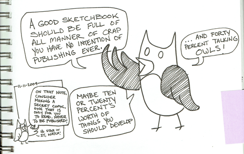 The owl was a from a popular design I had made on Zazzle, and became a motif in my sketchbook. Soon, it started talking.